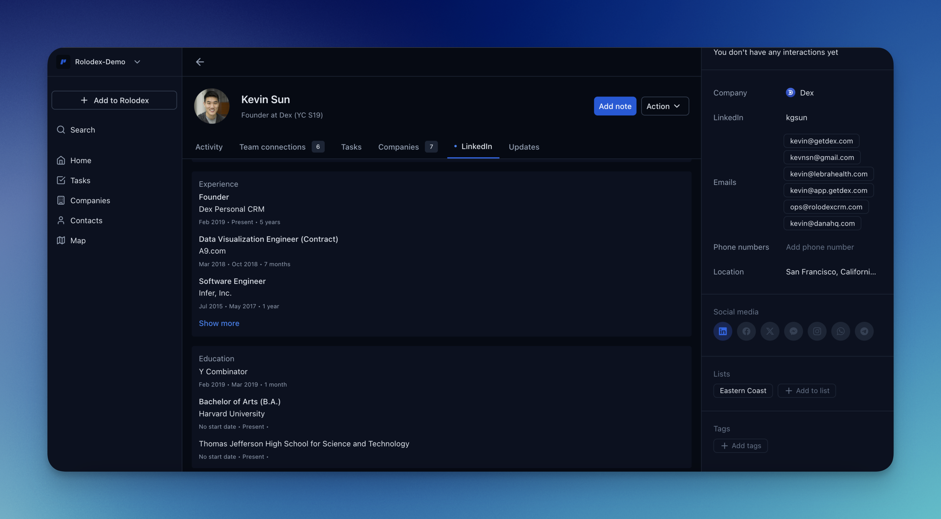 Rolodex can seamlessly integrate with LinkedIn. After connecting your LinkedIn account:🔨Your LinkedIn connections will seamlessly integrate with Rolodex, staying consistently updated. We’ll automatically refresh your contacts’ titles, profile pictures, and more, ensuring everything stays current.📧 Receive notifications whenever your LinkedIn connections update their titles. When they embark on new career journeys, seize the perfect chance to reconnect!